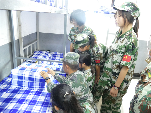 为引导学生培养良好的劳动习惯和有条理讲效率的生活作风,营造整洁舒适的生活环境,同学们在教官的带领下学习内务整理。