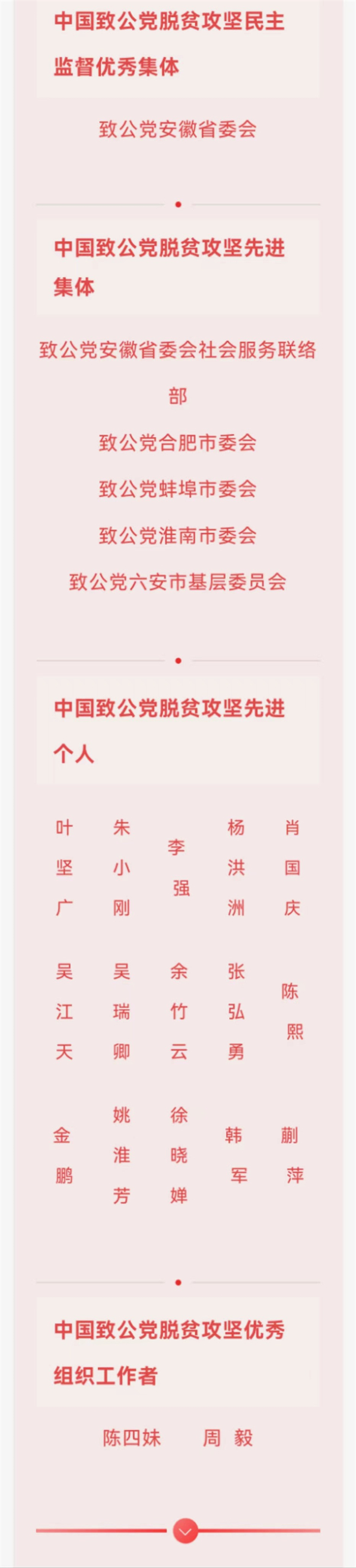中共十八大以来,省委会按照致公党中央和中共安徽省委省政府脱贫攻坚工作部署要求,主动融入脱贫攻坚大局,团结带领全省组织和广大致公党员,坚持用情用心用力用责,积极践行脱贫攻坚、建言脱贫攻坚、聚力脱贫攻坚,为助力对口帮扶地区高质量打赢脱贫攻坚战做出了积极贡献,在参与脱贫攻坚实践中交出了一份让地方党委政府满意的答卷。在安徽省直单位定点扶贫工作成效考核中,省委会定点帮扶工作连续四年获评等次为“好”,并均位居民主党派及工商联组前列。今年5月,省委会社会服务联络部还荣获“安徽省脱贫攻坚先进集体”称号,并作为先进集体代表上台领奖。