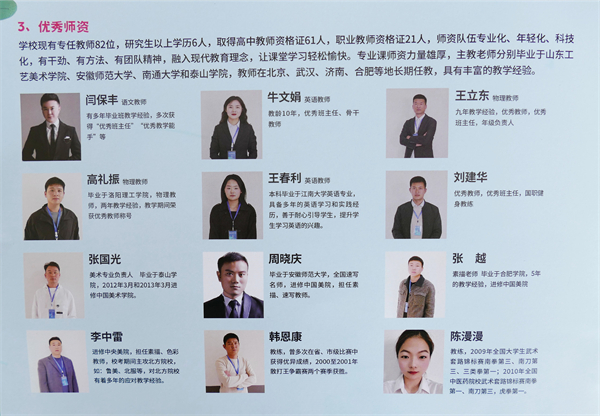 学校现有专任教师82位,研究生以上学历6人,取得高中教师资格证61人,职业教师资格证21人,师资队伍专业化、年轻化、科技化,有干劲、有方法、有团队精神,融入现代教育理念,让课堂学习轻松愉快。专业课师资力量雄厚,主教老师分别毕业于山东工艺美术学院、安徽师范大学、南通大学和泰山学院,教师在北京、武汉、济南、合肥等地长期任教,具有丰富的教学经验。