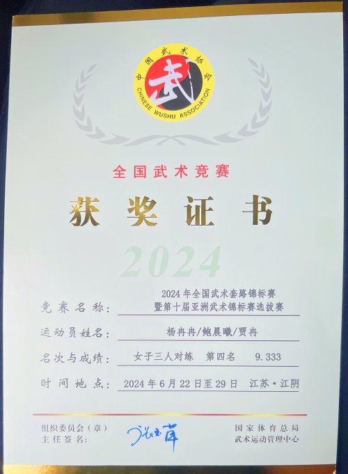 2024 年参加全国武术套路锦标赛暨第十届亚洲武术锦标赛选拔赛女子三人对练第四名。