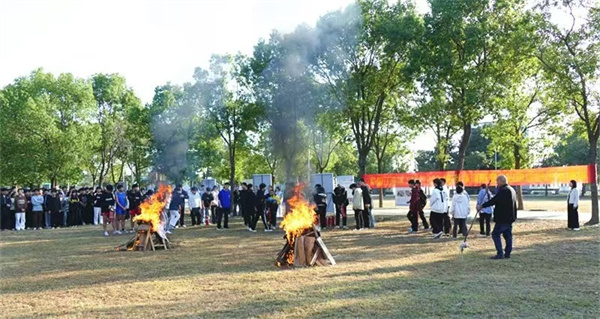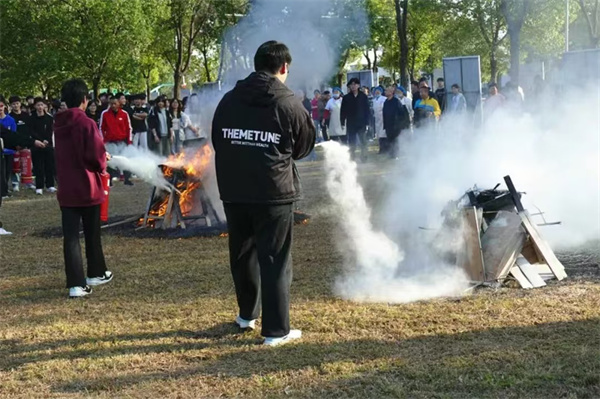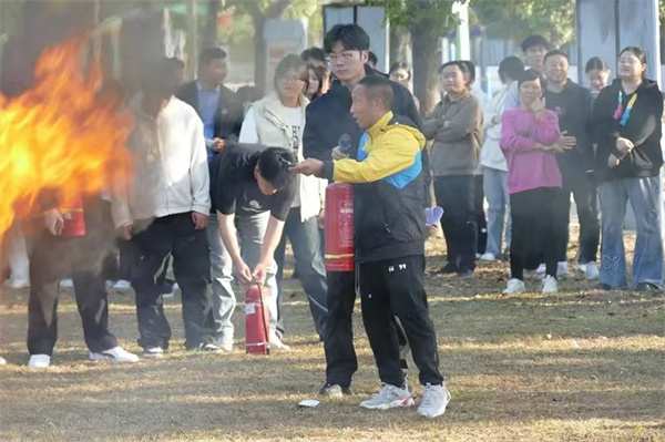 学生到达安全场所后,何老师为师生们讲解灭火器的正确使用方法和注意事项,并进行实际操作演示。学生代表、教师代表和后勤人员亲自体验使用灭火器灭火的过程。